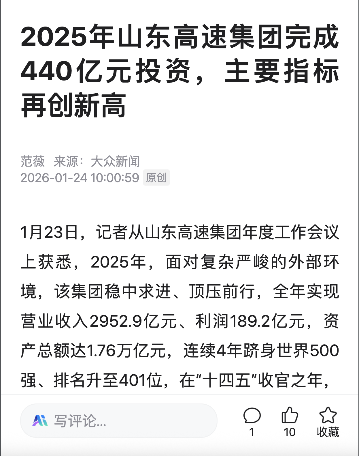 【大众日报】2025年山东高速集团完成440亿元投资,主要指标再创新高